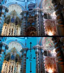 Theatrical repetition is a technique used by the architect. In some instances, it can be repetition by through symmetry, such as two equal parts divided by an axis. In other instances, is reiteration of a single element, as with the four representations of Saint Ignatius. The eight-pointed star is found in many places. The fleur de lis, the spiral, the Solomonic columns, and the saints are all repeated throughout the church and chapel.