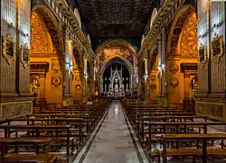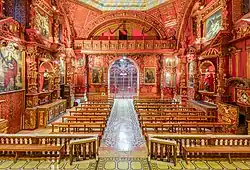 (...) Entirely gilded,[3] it has silver filigree around the central niche and in the tabernacle. In it, the Virgen del Rosario stands out, a Spanish sculpture that was a gift from the Spanish monarch in the 16th century. On the sides of the altarpiece are the altarpieces of Saint Anne and Saint Joachim, gilded on a red background. Arches and walls have applications of cherubs, American plants and fruits, covered in gold on a red background. The Chapel of the Virgin of the Rosary rests on an arch through which the street that leads to the La Loma Grande neighborhood passes. The chapel is closed by two domes with lanterns covered with green tiles.