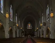 It was designed in the Gothic Revival architecture style largely by Montreal draftsman H. Ross Wiggs who worked for the firm of Harold Lea Fetherstonhaugh. The materials used in construction were steel and reinforced concrete, although the interior is made entirely of stone. Built in the style of a cathedral, the interior of the church has three aisles. A large stained glass window overlooks the main communion table. There are also two windows made by William Morris who was associated with the English Arts and Crafts Movement. The wrought iron screen located in one of the chapels won an award for the architect, Fetherstonhaugh. Many of the commemorative stained glass windows within the church originated from the former St. Paul Church.