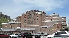 The adjacent school is a four-story, brick building with terra cotta accents in the Classical Revival style.[5]