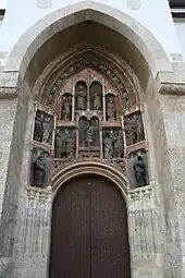 The Gothic composition of the portal consists of fifteen effigies placed in eleven shallow niches. On top are the statues of Joseph and Mary with the infant Jesus, and below them one can see St. Mark and the Lion; the Twelve Apostles are placed on both sides of the portal (four wooden statues replaced the original ones which had been destroyed). In its artistic composition and the number of statues, this portal is the richest and the most valuable Gothic portal in southern Central Europe.