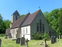 The early medieval style building was built in 1869 and designed by William Burges. Its tower of 1876 is by W. P. Manning featuring a half-octagonal projection (bastion) beside one of its two buttresses and near the modest porch.[2] The interior has a simple brick design, whilst the exterior is of knapped stone with a stuccoed tower over brick.[3] The church is a Grade II listed building.[4] J. Mordaunt Crook describes it as "outspoken to the point of bluntness",[2] and Nairn comments that it is "honest, but not very good".[3]