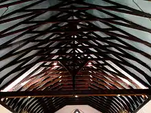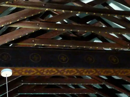 On entering this small and unassuming building, the unexpected glory of the interior for the visitor is the scissor-truss roof,[21] which after more than a century retains rare stencil paintings by Powell Bros of Leeds on the chancel beams.[22] Beneath the paint on the plastered north and south walls of the nave are hidden stencil paintings and possibly spirit frescoes by the same artists, revealed in a pre–1914 photograph in the church archives.[23] Although this building is too simple to permit a gallery of columns and bays, Barber has still managed to include a few small columns by recessing the three-light nave windows into the wall, and fitting a single slender supporting column into each recess.[24]