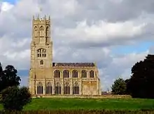 The large present church is named in honour of St Mary and All Saints, and has a distinctive tall tower dominating the local skyline. The church is Perpendicular in style and although only the nave, aisles and octagonal tower remain of the original building it is still in the best style of its period.[3] The tower is 78 feet (24 metres) high to the battlements, and is 116 feet (35 metres) high to the pinnacles of the octagon.[4]