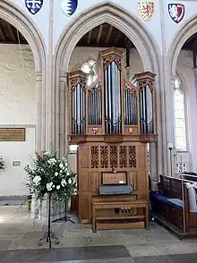 The current 2 manual pipe organ is by Vincent Woodstock and dates from around 2000. A specification of the organ can be found on the British Institute of Organ Studies National Pipe Organ Register at D08348.