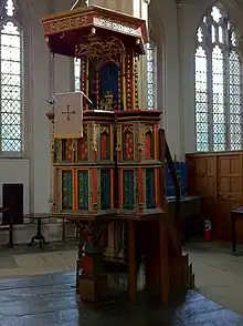 The church contains a notable 15th-century painted pulpit donated by Edward IV carrying the royal arms, flanked by a bull for George of Clarence and a silver boar for Richard of Gloucester.