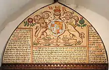 The ground under the arcade between the nave and the aisle has settled, causing the arcade to lean. In the base of the tower is a bread shelf. The 18th-century box pews are still in the church. In the northeast corner of the nave is the civic pew which contains a wrought iron stand to hold the mayor's mace. Above this pew is a cartouche carrying the Cinque Port Arms. The large font stands between the nave and the aisle. It is Norman in style and carved with blank arcading.[4] It is constructed in Bethersden marble and has a 17th-century cover.[6] Over the chancel arch are the 1688 Royal arms of James II. On each side of the east window are boards inscribed with the Ten Commandments and the Lord's Prayer. The stained glass in the east window dates from the 20th century. It was designed by Martin Travers, and commemorates a rector of the church who died in 1931. The windows in the nave contain medieval stained glass depicting the Coronation of the Virgin, the Virgin and Child, and the emblems of Saint Mark and Saint Luke. In the nave is a brass dated 1605.[4] There are three hatchments in the church, two of them dating from the 17th century.[6] The single-manual organ was made by G. M. Holdich, and rebuilt in 1899 by Browme. Formerly in St Martin's Church, Canterbury, it was moved here in 1908.[4][7] There is a ring of four bells. They were all cast by Joseph Hatch, one in 1624, and the other three in 1633.[8] The bells are no longer ringable.[4]