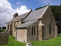 The hamstone building has slate roofs with a bell turret at the western end. It has a three-bay nave and single-bay chancel which are supported by buttresses.[1]