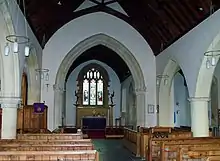 The interior of the church includes a wooden board listing the names of 23 people from the parish who died in World War I and 13 in World War II.[12]