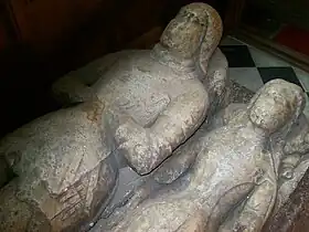 The Derby Chapel is enclosed to the north and west by a 17th-century wooden screen with high balusters and wrought iron fleur-de-lis cresting.[3][11] The chapel also contains three alabaster Derby effigies (probably to Thomas Stanley, 1st Earl of Derby and his two wives) and two tomb chests.[1][3] The Scarisbrick Chapel contains a hatchment and a wall monument.[1] James Stanley, 7th Earl of Derby is also buried at the church.