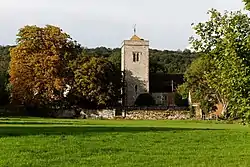 The tower, and porch beneath it, probably date from the 15th century. It has a barrel vault through its north-east side to allow access to an earlier south door, two contemporary buttresses on the south wall and a ragstone doorway and dressings. The tower has small trefoiled windows on the south and west sides and three two-light perpendicular cinquefoil-headed windows, under square hood moulds, on the upper part of the tower on the east, south and west sides. It has a parapet and a low pyramid roof.[10]
