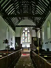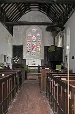 The nave and chancel appear to have been constructed on a continuous foundation of large blocks, some of which are sarsen. The original opus spicatum masonry is made from whole flints, ironstone (from the Folkestone Beds) and Kentish ragstone. The dressings are made of tufa and the rere-arches of the original windows are greensand. Bath stone, Portland stone and brick was used for repairs in the 18th and 19th centuries while cement and thin tiles have been used for more recent repair work. The west end of the nave has a doorway and lancets that probably date from the 13th century. The chancel is only slightly smaller than the nave and there is no chancel arch. The western window on the south side of the chancel is unusually far to the west and has been rebuilt externally. The nave and chancel have a continuous rafter, collar and soulace roof that may date from the 14th century. The south wall of the nave adjoins the north wall of the tower.[3][10]