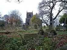 The churchyard contains around 2,000 graves of patients who died at Kirkburton in Storthes Hall Hospital (1904–1991). Most of these graves are unmarked, in a separate field behind the church which was added by Rev. Arnold Escombe Jerram before he left in 1910.[16][34] By 1913 there was fear in the village that the pauper burials were causing epidemics, because the sexton was saving money by leaving graves open to rain and weather, and not filling them with earth until they each contained their full complement of four coffins. The authorities claimed that Storthes Hall's use of the graveyard benefited Thurstonland by the payment of rates and that only fifty paupers per year, who were unclaimed by relatives, were buried there. Rev. P.S. Brown, at that time vicar of Thurstonland and chaplain to Storthes Hall, claimed that the burials were no danger to health, even though the sexton had to ladle out water from open graves before subsequent funerals.[34]