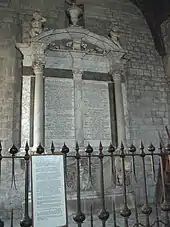 Most of the interior fittings, including the font, pews, pulpit and screen are from the 1857 restoration; however some of the monuments are considerably older. These include the marble tomb of Joseph Langton who died in 1701.[1] A cast-iron railing surrounds the vault which also has an inscription on marble commemorating his seven children who all died prematurely.[5]