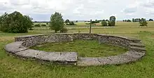 Only two ground level walls of this Medieval church survive to this day. The remains of the foundations show that the floor plan was that of a round church (Swedish: rundkyrka). Its round central room had a diameter of about seven metres and the walls were 1.1 metres thick. In the east, there was a rectangular apse, which probably housed the altar. The church was surrounded by an old church square, paved with flat stones.[1] The ruins are located to the north of the Ålleberg castle and southeast of Falköping. On account of the church's small size, it is assumed that the congregation were accustomed to stand during services.