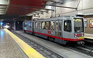 A red-and-silver light rail train at a surface stop in the center of a city street
