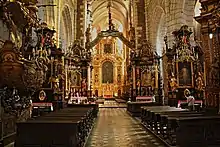 The Church of St. Casimir the Prince located at ul. Reformacka 4 street in the Old Town district (Stare Miasto),[5] (adjacent to Baroque Franciscan Monastery) with the catacombs in the crypt, contains some of the most secret places in the city. The crypt holds almost 1,000 mummified bodies put on public display but once a year on All Souls Day.[6] The unique climatic conditions found in the basement caused the bodies of the dead to undergo the process of natural mummification and are in excellent state still today (see: picture gallery).[7][8] The High Gothic Church of St. Catherine's in Kazimierz – next to Skałka – features a 3-story high Baroque altarpiece; the Romanesque Church of the Holiest Savior at Bronisławy street was rebuilt 1670–1673. The Gothic Church of the Holy Cross at pl. Sw. Ducha square has Baroque altarpieces; the Church of the Lord's Transfiguration, built 1714–1727, is also found in the Old Town; the Gothic Church of St. Mark at the corner of Sławkowska and Marka streets has a Renaissance interior. The Church of the Mother of God, the Queen of Poland in Bienczyce district of Nowa Huta, an ultra-modern church built in the shape of the Noah's Ark, with a lunar stone in its Tabernacle brought back from the Moon by American astronauts. Other notable churches include the Church of St. Nicholas with a 15th-century altarpiece; the Church of St. Norbert with a Rococo altarpiece from mid-18th century; the Church of St. Theresa with its 14th-century statue of the Madonna; the Church of the Virgin Mary's Annunciation with an Italian-Baroque interior circa 1675 and the adjacent Carmelite monastery.[1]