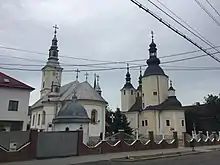 The brick church has a single nave, with two spires on the western end and a trefoil altar at the east. The massive central dome has a bulbous extension. The entrance portal is semicircular. The main facade is lightly decorated with shell motifs; the side facades feature windows in similar patterns to the main one. The nave has a vaulted, semi-cylindrical ceiling; along with the side walls, it is decorated with stucco flowers. The richly ornamented iconostasis has 19 icons and dates to 1857. The altar painting, depicting the Ascension of Jesus, copies the Satu Mare Cathedral. The 1888 dome painting depicts scenes in the Virgin Mary's life.[2] Today, the congregation is Hungarian, and the church is known as Szent Mihály és Gábor arkangyalok görög-katolikus templom in their language.[3]