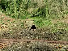 The woodland is situated on the coast between the towns of Paignton and Brixham. The area is designated as a part of the South Devon Area of Outstanding Natural Beauty, one of a number of similarly protected landscapes within the United Kingdom.[2] There are multiple entrances to the woods, including one at the end of a lane near Churston Court and one above Fishcombe Cove in Brixham. The South West Coast Path[3] and the John Musgrave Heritage Trail pass through the woodland. As of 2018, the main path leads through the cleared area at the heart of the woodland, which is now composed primarily of shrubs and saplings, from the lane near Churston to Churston Cove.
