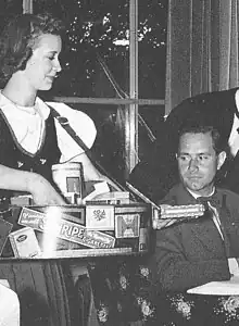 Cigarette girls were a common sight in restaurants, clubs, bars, airports, and casinos in the 1930s and 1940s in the United States.[1] From the end of World War II to the 1950s, cigarette girls further expanded into sporting events and the lobbies of theaters and music halls during intermissions.[1]