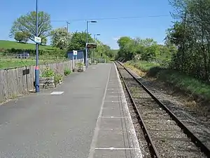 The station is unstaffed (like almost all others on the line), with a single active platform and basic amenities (CIS display, help point and timetable information board). Step-free access is provided from the station entrance to the platform, though the access path is unmade and somewhat uneven.[1]