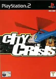 City Crisis (シティ クライシス, Shiti Kuraishisu) is a helicopter simulation developed by Syscom Entertainment, and published by Take-Two Interactive for the PlayStation 2. The players role in the game is a rescue helicopter pilot. The object of the game is to save civilians from fires that spring up around the city. The player must also put out the fires using water that is dumped from the helicopter. Each mission has a time limit, but the faster the player saves people and puts out fires, the more time they receive to complete the next part of the mission. The game also features missions where a criminal is driving around the city, and the player must use their searchlight to help the police locate and stop them.