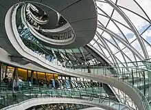 A 500-metre (1,600 ft) helical walkway ascends the full ten storeys. At the top is an exhibition and meeting space with an open viewing deck that was occasionally open to the public. The ramp could not be used as intended for security reasons.[18] The walkway provides views of the interior of the building, and is intended to symbolise transparency; a similar device was used by Foster in his design for the rebuilt Reichstag (parliament), when Germany's capital was moved back to Berlin. In 2006 it was announced that photovoltaic cells would be fitted to the building by the London Climate Change Agency.[19]