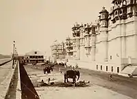 City Palace (Raj Mahal), Udaipur is a palace complex situated in the city of Udaipur in the Indian state of Rajasthan. It was built over a period of nearly 400 years, with contributions from several rulers of the Mewar dynasty. Its construction began in 1553, started by Maharana Udai Singh II of the Sisodia Rajput family as he shifted his capital from the erstwhile Chittor to the newfound city of Udaipur.[1] The palace is located on the east bank of Lake Pichola and has several palaces built within its complex.[2][3][4][5][6]