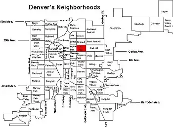 The City Park neighborhood has the same boundaries except for having Colfax Avenue as its southern boundary, which is two blocks south of 17th Avenue. Therefore, the entirety of the neighborhood is only two blocks wide, but about a mile long. The area in the southwest corner of the neighborhood consists of East High School and a green area called the City Park Esplanade, which in some ways extends the park south two blocks to Colfax Avenue. The eastern part of the neighborhood around Colfax Avenue (along with parts of the Congress Park neighborhood across Colfax) is also known as the "Bluebird District", for the Bluebird Theatre located on Colfax and the urban developments around that area. There is also a neighborhood called "City Park West", which is located just west of the park to Downing Street and commonly known as Uptown. It has the same southern and northern borders as City Park, and has York Street as its eastern border.