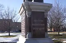 The 50-foot (15.2-m) tall memorial has base dimensions of 10 feet (3 m) by 6 feet (1.8 m).[3] The monument is constructed from a combination of marble, masonry, and the metal used for the sculpted copper and masonry soldiers. The structure also incorporated wood into its design.[3] The rifles the figures on the base hold and the bases that they stand on are made of wood.[3] The front facade is adorned with a marble plate engraved with an excerpt from U.S. President Abraham Lincoln's Gettysburg Address.[3] Each of the other facades, also marble faced, are emblazoned with the names of major battles and campaigns of the war. The word "Antietam," representing the Battle of Antietam, is misspelled on the east, marble facade of the memorial as "Anteitam."[8]