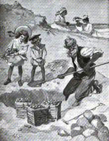 In 1950, the Maine Department of Sea and Shore Fisheries published a 12-page booklet titled "How to Prepare a Maine Clambake with Lobsters and All the Fixin's".[7] The 1975 edition of Joy of Cooking, the perennial best-selling cookbook first published in 1931, describes two versions of a clambake. The big version is cooked in a sandpit, and the small version is cooked in a large pot on a stove or a grill.[8]