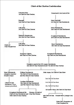 Prior to the 14th century, the Clan Chattan was a conventional Scottish clan.[5] However it evolved into an alliance or confederation of clans which was made up of: