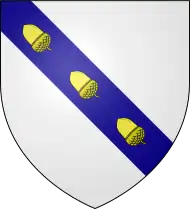 “Argent, on a bend, azure: three acorns in the seed. Crest, a falcon proper. Supporters, dexter, a man in armour, sinister, a horse rampant. Motto, Fide et Marte.”[16][18][3]