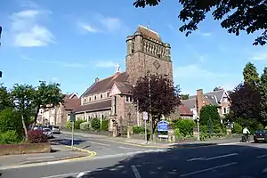 Among the many places of worship in Leicester are Congregational churches.[3][4][5] The first Congregational church in Leicester was founded in 1801. Numerous others were built in the 19th century.[6] The Clarendon Park Congregational Church was designed by James Tait (1834-1915) and built in 1886.[7][8][2] It is built of granite rubble with ashlar dressings and a roof of red tiles. It was designated a Grade II listed building (13613930) in 1975.[9]