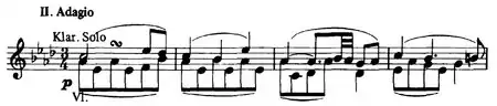 - Adagio (in A♭ major and modified sonata form without development; only the solo clarinet, violins, and cellos play in this movement, with all other instruments tacet)