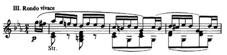 - Rondo (Vivace) (in C minor and in sonata rondo form) – The overall form is "First Subject in C minor – Secondary Subject in E♭ major – First Subject in C minor – Development in A♭ major – Secondary Subject in C major – First Subject in C minor – Coda in C minor". Unlike many classical works, the finale fades away in C minor, instead of ending with loud chords.