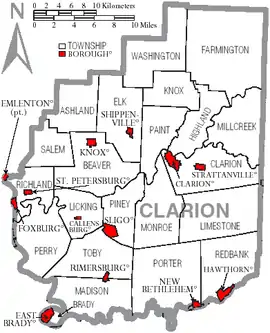 Under Pennsylvania law, there are four types of incorporated municipalities: cities, boroughs, townships, and, in at most two cases, towns. The following boroughs and townships are located in Clarion County: