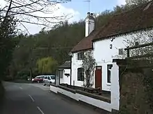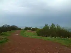 The hills along with the Lickey Hills form a range of hills in north Worcestershire known as the Clent-Lickey range (or the Clent-Lickey ridge).[10][11] The largest of the Clent Hills is Walton Hill which is 1,037 feet (316 m) high followed by Clent Hill at 1,014 feet (309 m). They are separated by a valley known as St. Kenelm's Pass, which starts as an escarpment one side of which along with the sides of the two hills falls away towards Uffmoor Wood; water flowing down this slope enters streams which become the River Stour. Close to the top of the escarpment, but just on the other side, stands High Harcourt Farm (which belongs to the National Trust,[12] but its farm land is not open to the public). Below the farm the escarpment falls away and becomes a sharp V valley in which a stream flows down into Clent village. Where the valley sides are at their steepest the Walton Hill side of the valley is known as Clatterbach. In the past, before steam power replaced water power, the stream in the valley was dammed at regular intervals to provide power for watermills. The remains of one such dam can be seen behind the Vine Inn in Clent which was once a mill.[13]