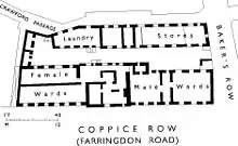 The Clerkenwell Workhouse stood on Coppice Row, Farringdon Road, in London. The original workhouse was built in 1727 but that building was replaced by one twice as large in 1790. It was described by The Lancet in 1865 as one of the two worst in London, and "fit for nothing but to be destroyed" which it was in 1883.[1]