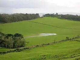 Corraith House stands in an elevated position to the south of the old loch's shore, recorded as 'Korreth' in 1654 and Corries in 1747. Above the loch on Wardlaw Hill are the remains of a 'citadel' fort or minor oppida, occupying the total summit plateau area., at about 145m OD, comprises an inner fort or settlement on the highest point of the plateau; it has a collapsed stone-built rampart and an entrance may have been positioned on the northern side. A ruined wall of a later date runs along the top of the rampart around the western half of the old fort.[8] The older OS maps indicate that a flow of spring water once ran down to the Slough Burn from the site of what became the Ayrshire County Council water tank built in 1932.