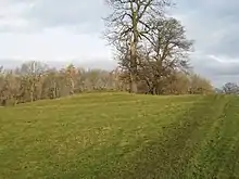The Betty Watson's Hill Bronze Age barrow 1,120 feet (340 m) east of Cliffe Hall was excavated in 1904. It was described as a flat-topped bowl barrow, and it was noted that "the large hole in the centre is probably due to robbers or an unrecorded excavation".[37][38] In 2007, a cup-marked 29×23×16 cm boulder with two 5 cm cups was found in field-edge dumps 50m south-east of the Betty Watson's Hill barrow. "The cobble was removed from the field edge and placed back on the barrow top. This now puts an early Bronze Age date to the monument." The boulder is believed to have originated in the robbed-out barrow.[4][39] A round barrow is recorded 190m south-east of Cliffe Hall.[4][40]