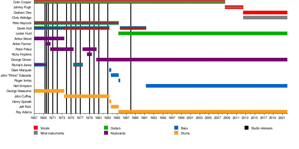 Jones left the group in 1969 and Holt began playing bass.[3] The band switched labels to Harvest Records in 1970 and subsequent records had a more rock-oriented feel.[4] John Cuffley replaced Newsome in 1971.