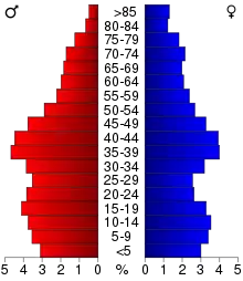 Of the 14,005 households, 32.7% had children under the age of 18 living with them, 56.5% were married couples living together, 8.7% had a female householder with no husband present, 30.3% were non-families, and 25.1% of all households were made up of individuals. The average household size was 2.55 and the average family size was 3.02. The median age was 39.3 years.