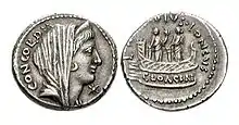 Denarius of L. Mussidius Longus (42 BC) showing head of Concordia, and two statues of Venus Cloacina on platform with balustrade of the shrine of Venus Cloacina (Crawford 494/42b; CRI 188a; Sydenham 1093a; Mussidia 6).