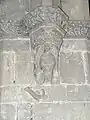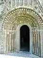 The earliest part of the church dates back to around 1180.[1] Its doorway is the crowning achievement of Hiberno-Romanesque style. It is in six orders, and has a large variety of motifs, animal heads, foliage, human heads etc. Above the doorway is a pointed hood enclosing triangles alternating with bizarre human heads, and below this is an arcade enclosing more human heads. The early 13th century east windows in the chancel is an example of a late Romanesque windows. The chancel arch was inserted in the 15th century, and is decorated with angels, a rosette and a mermaid carrying a mirror. The supporting arches of the tower at the west end of the church are also decorated with 15th century heads, and the innermost order of the Romanesque doorway was also inserted at this time. The sacristy is also 15th century. The church had a Romanesque south transept, which is now in ruins, and a Gothic north transept, which has been removed. In the Roman Catholic church one mile to the south is a 14th-century wooden statue of the Madonna and Child, and on the roadside near this church is a 16th-century tower-house.