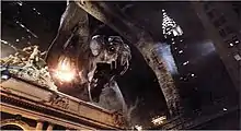 The monster was first referred to in the viral marketing campaign for Cloverfield, including a recording of its roar, foreign news clips about a monster attack and sonar images.[3] It then made its first full appearance in the film, where it was seen to be 25 stories tall[4] and rampaging through New York City while being attacked by the United States military.[5]