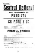 The Romanian National Theatre was officially opened on 18 September 1919, simultaneously with the Romanian Opera and the Gheorghe Dima National Music Academy. The inaugural performance, Poemul Unirei (English: The Unification Poem) by Zaharia Bârsan, took place on 1 December 1919.