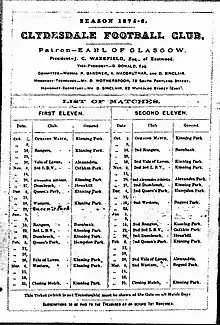 The club was formed in 1872, in the wake of the Queen's Park. In 1873, Clydesdale was one of the teams to found the Scottish Football Association, with the club's Archibald Campbell being appointed President,[2] and made a generous donation of £5 towards the cost of the Scottish Cup.[3] This was more than any team other than Queen's Park, which had a much larger membership (103 to Clydesdale's 30 at the time).[4]
