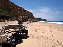A group of escaped convicts led by a married couple William and Mary Bryant were the first Europeans to find and use Australian coal, at the end of March 1791. They found "fine burning coal" near a "little creek" with cabbage tree palms 'about 2 degrees' north of Sydney, "after two days sailing". This first hand account of the discovery—written by one of the party James Martin—was found in a collection of manuscripts and published in 1937.[2] The escapees never returned to Sydney and their discovery of the coal remained unknown, until after they were recaptured at Kupang. William Bryant also wrote an account that is now lost but William Bligh—later a governor of New South Wales—saw it, when he visited Kupang in 1792. Bligh made a summary of Bryant's account in his log and quoted him as saying, "Walking along shore towards the entrance of the Creek we found several large pieces of Coal—seeing so many pieces we thought it was not unlikely to find a Mine, and searching about a little, we found a place where we picked up with an Ax as good Coals as any in England—took some to the fire and they burned exceedingly well".[3] It is likely that the location was near the entrance to Glenrock Lagoon, where coal is exposed, low in the sea cliff, and which was later the site of the Burwood Colliery.[4]