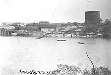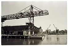 The first wharves on the Basin were those on the eastern side, opposite the wharves of the Dyke.[95] At first, the Basin was used as mooring and as a location to unload ballast. By mid-1903, two—of eventually six—coal loading cranes were operating there,[98] essentially as an extension to the loading operations of the Dyke. In 1913, work was underway on another line of wharves, on the western side of the Basin.[99] Those new wharves were completed in 1915.[100]